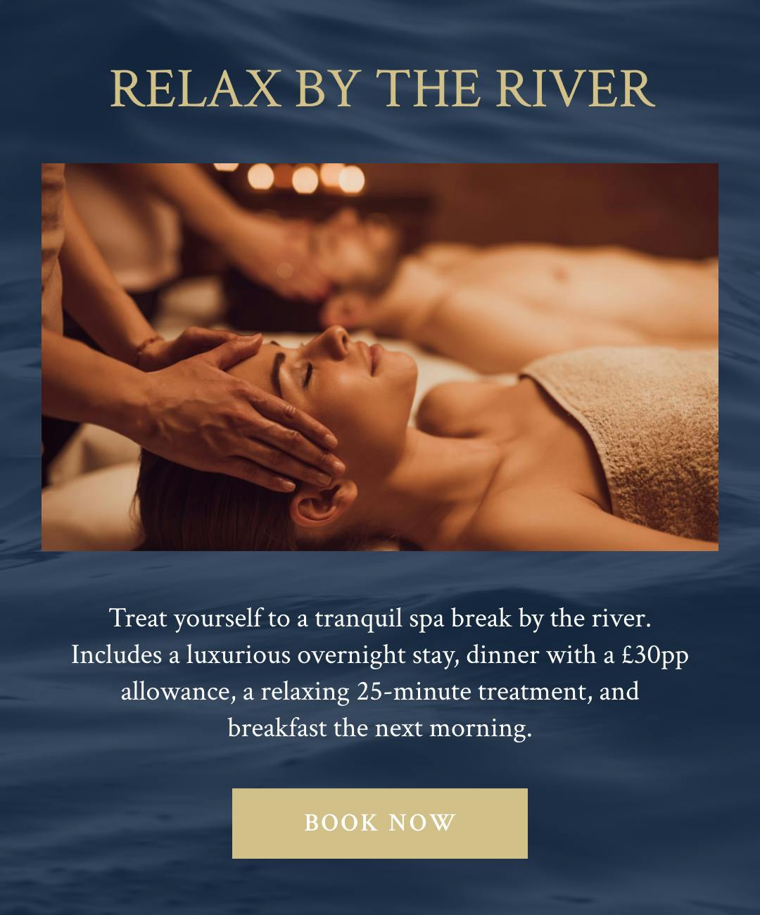 Escape to the riverside with our indulgent spa break, enjoy an overnight stay in a river-facing room, dinner and a 25-minute spa treatment each.